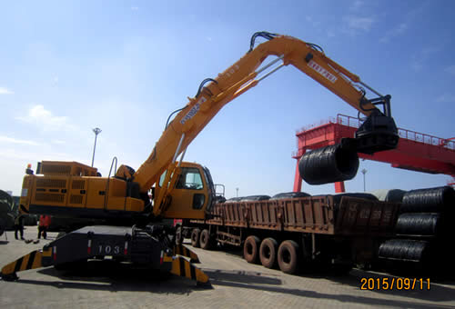 八達重工雙動力抓料機改進后配裝盤圓、鋼卷專用裝卸吊具,應(yīng)用于量大鋼卷、盤圓的裝卸車、裝卸船、貨場的堆碼垛作業(yè)。